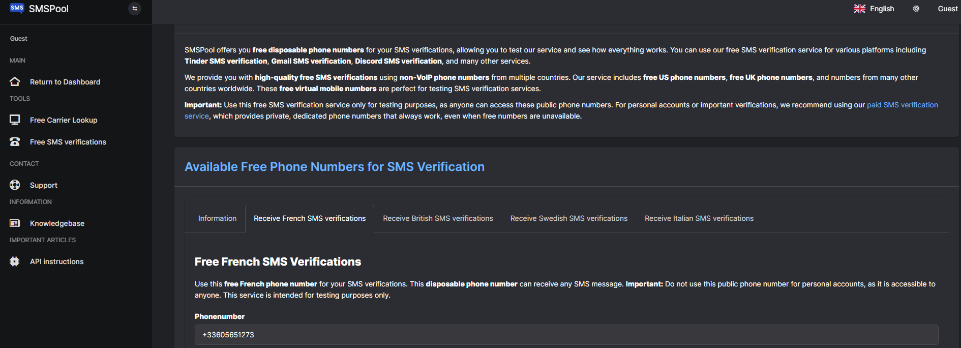 Overview: SMSPool, a major paid verification service, offers a free tier of temporary non-VoIP numbers from multiple countries, including the US and UK. Like other public services, you select a number and wait for the SMS code to appear on the public page.