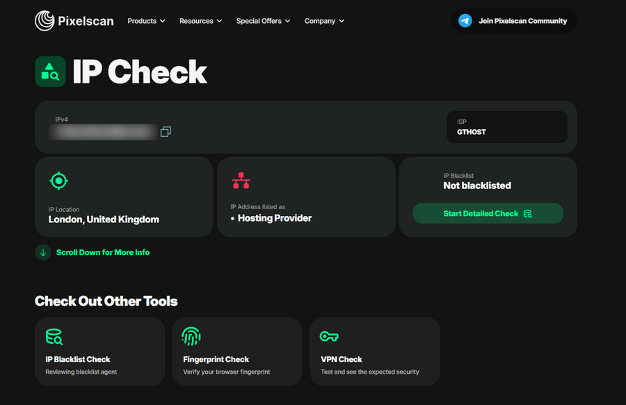 Pixelscan is mainly known as a browser fingerprint checker, and a well-regarded one. That background is relevant here because their IP checker is built on the same depth of understanding — they know exactly what websites look for when evaluating an IP, which makes the tool more reliable than most standalone proxy checkers. If you trust their fingerprint analysis, the IP check is coming from the same place.