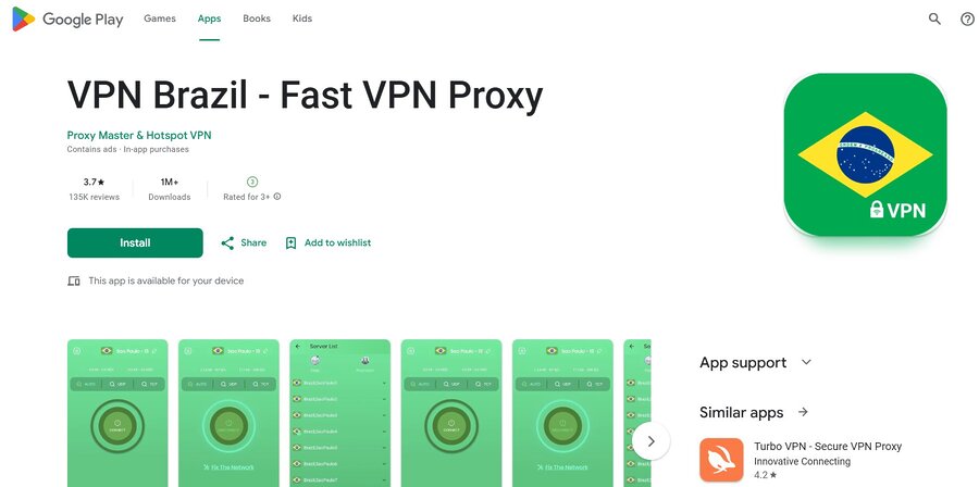 This is a top result for “VPN Brazil” on Google Play. It is a dedicated Android app designed specifically to provide Brazilian IP addresses. It is simple and free.