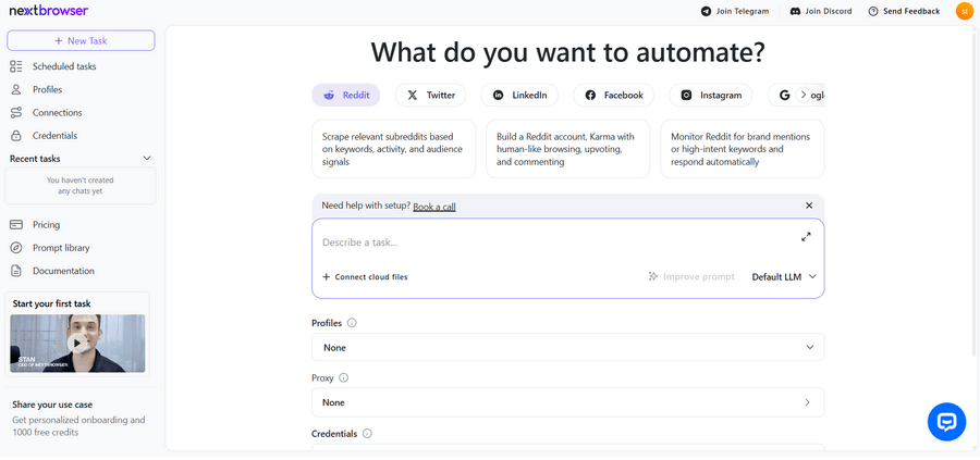 Nextbrowser automates this warm-up 24/7 in real cloud browsers using plain-language prompts. You can: