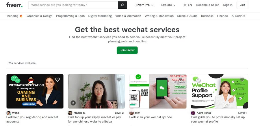 Fiverr is a global freelance marketplace where you can find professionals offering WeChat-related services, such as account creation assistance, QR code scanning, and mini-program development.