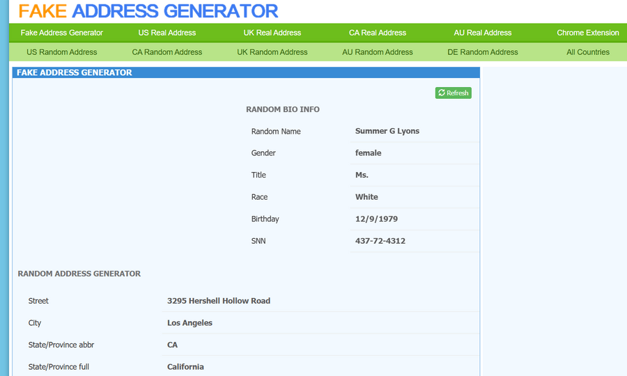 A fake adress generator is a tool that creates random address details, usually including: