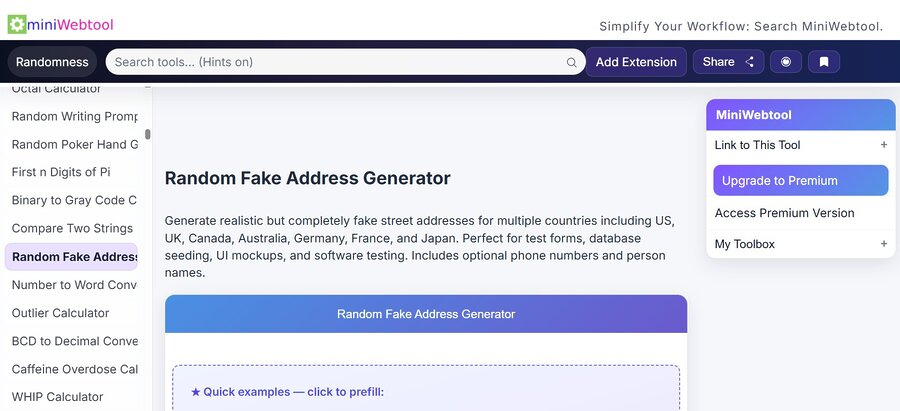 | MiniWebTool Random Fake Address Generator | Bulk dummy data and exports | CSV/JSON-style testing use cases | Newer tool, should be reviewed before production use |