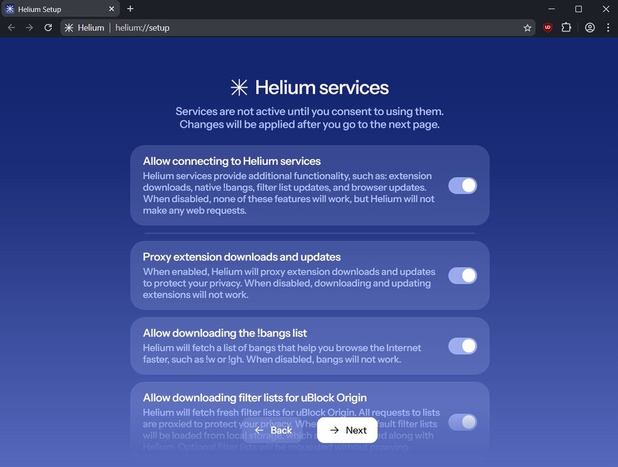 The first time you launch Helium, it stands out with its minimalist design and transparency. During setup, the browser shows a “Helium Services” screen. This is where you decide how the browser connects to the internet.