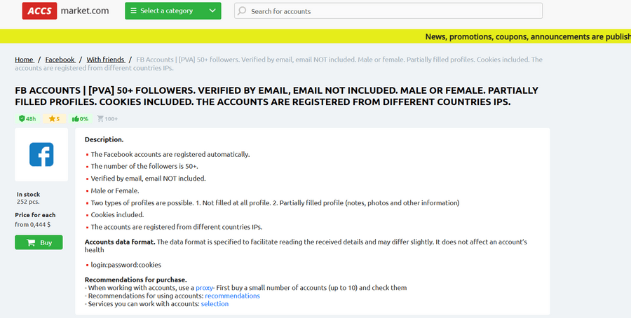 Overview: AccsMarket is a direct vendor specializing in the bulk sale of various social media accounts, including Facebook, with a focus on high volume and low prices.
