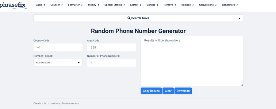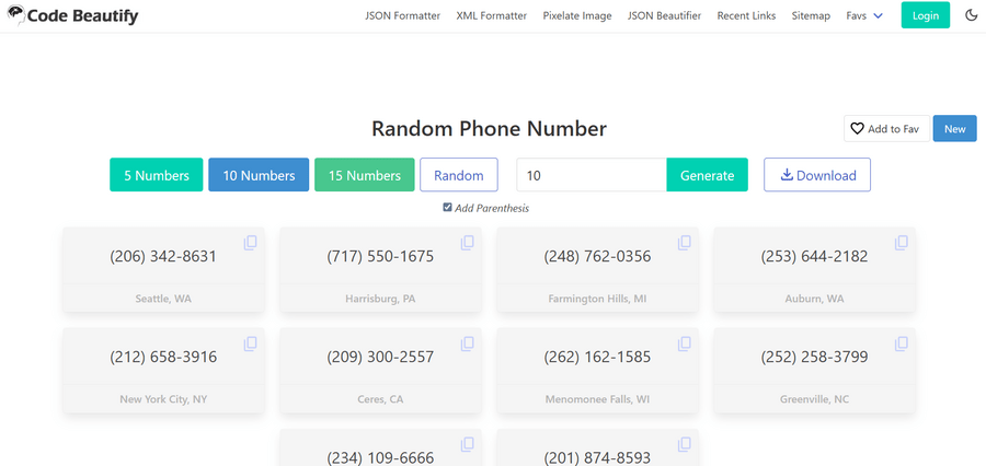 Overview: CodeBeautify is a versatile online utility suite primarily aimed at developers. Its random phone number generator is one of many tools it offers, allowing users to quickly create a list of numbers in the US format directly in their browser.
