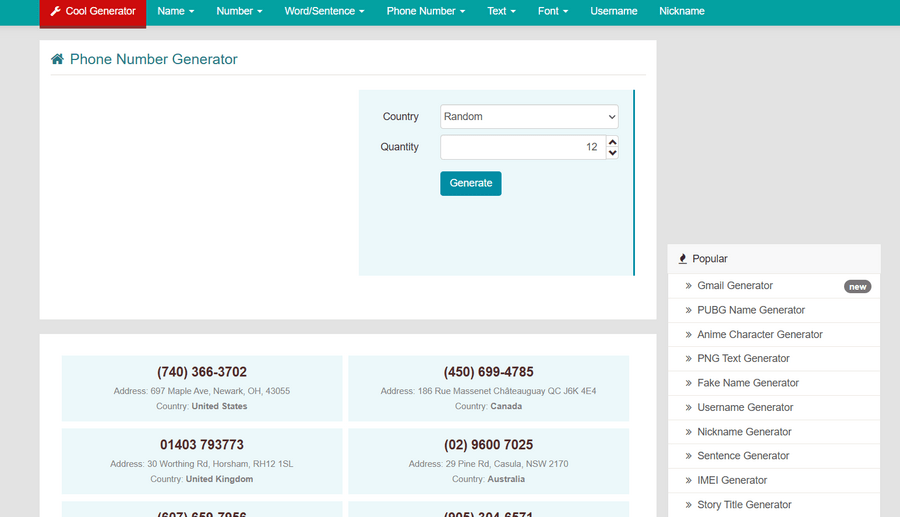 Overview: A simple, no-frills tool where you specify the quantity, and it instantly creates a list of random phone numbers. It is one of the quickest options for generating a large volume of numbers for bulk data tasks.